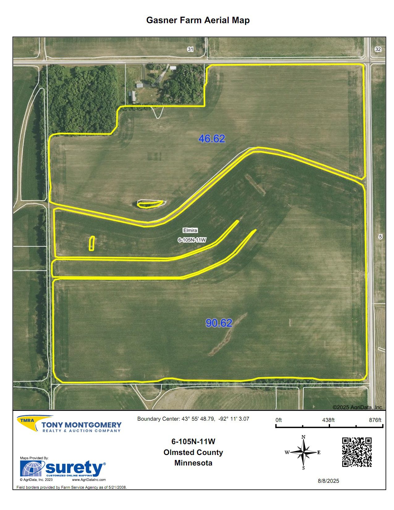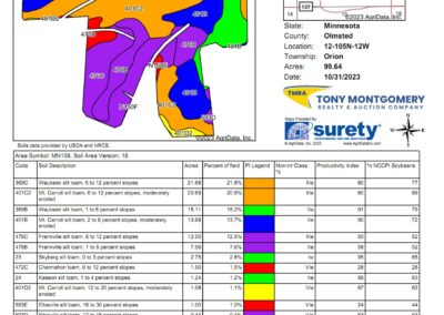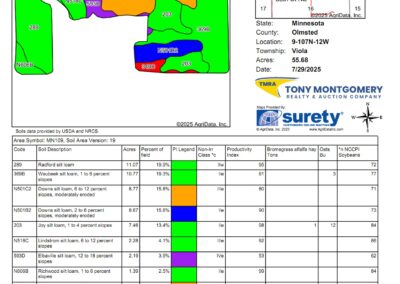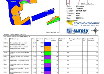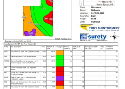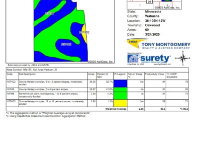 Terms: This auction will be a 10 day Online Auction. Bid Price X 67.8 Acres + 3% buyers Fee = Full Contract Purchase Price. Terms of sale include but not limited to buyer(s) being responsible to perform their own “due diligence” regarding all aspects of the purchase. Tony Montgomery Realty & Auction Company, (TMRA), is representing the seller exclusively on all aspects of this real estate sale. A 3% buyer’s fee will be added on to final bid price to achieve full contract purchase price. Buyer(s) shall have all financing secured before bidding on this auction as there will be no buyer contingencies accepted within this auction. There will be no contingencies allowed at this auction including, but not limited to, financing. Real Estate taxes due and payable in the year of 2025 will be prorated to date of closing by buyer and seller. At the conclusion of the auction, buyer(s) and seller shall enter into a standard MN purchase agreement drafted by TMRA and buyer shall deposit non-refundable earnest money as time is of the essence. Earnest money deposited with TMRA shall be $50,000. Closing shall be on or before Friday, October 31, 2025. Seller, TMRA and all representatives of before mentioned are making no warranties or guarantees other than that stipulated through a Warranty Deed.