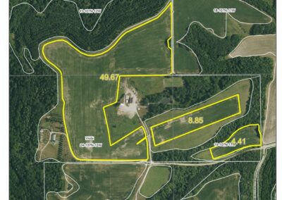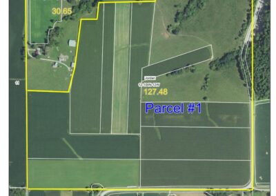 Parcel 1 BARE LAND: Consisting of 127.48 +/- surveyed acres of which 84.41 +/- acres are good productive tillable ground with a CPI rating of 82.4 with excellent soil of Fayette silt loam. This land lies like a “table top”! The balance of 43.07 +/- acres are a beautiful offering of land that has a building entitlement and offers pasture opportunity with a spring and small creek running through it.
